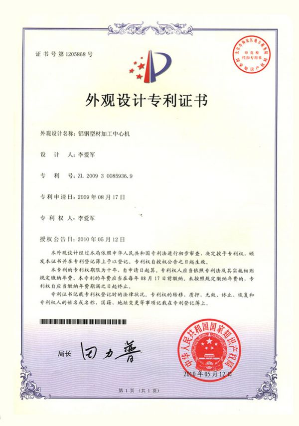 鋁鋼型材加工中心機(jī)外觀設(shè)計(jì)認(rèn)