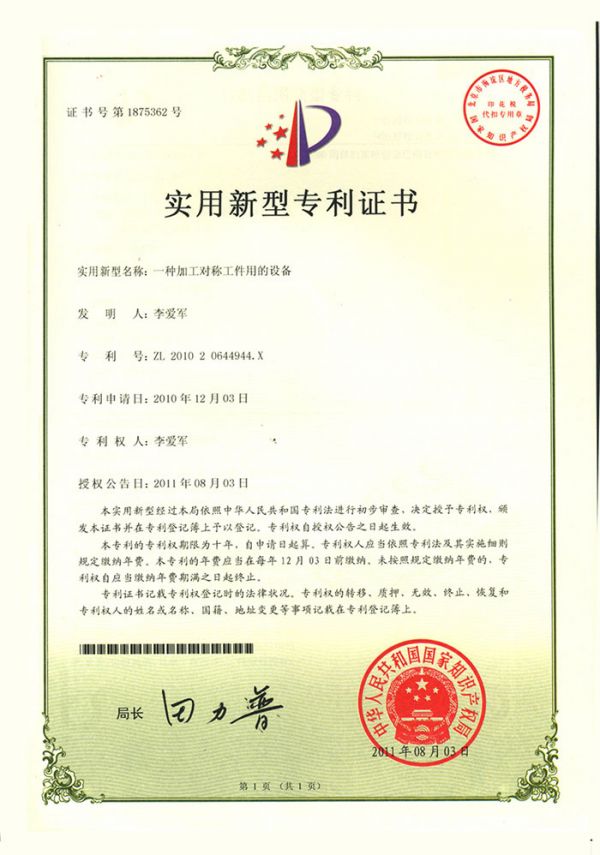 加工對(duì)稱工件用的設(shè)備專利證書(shū)